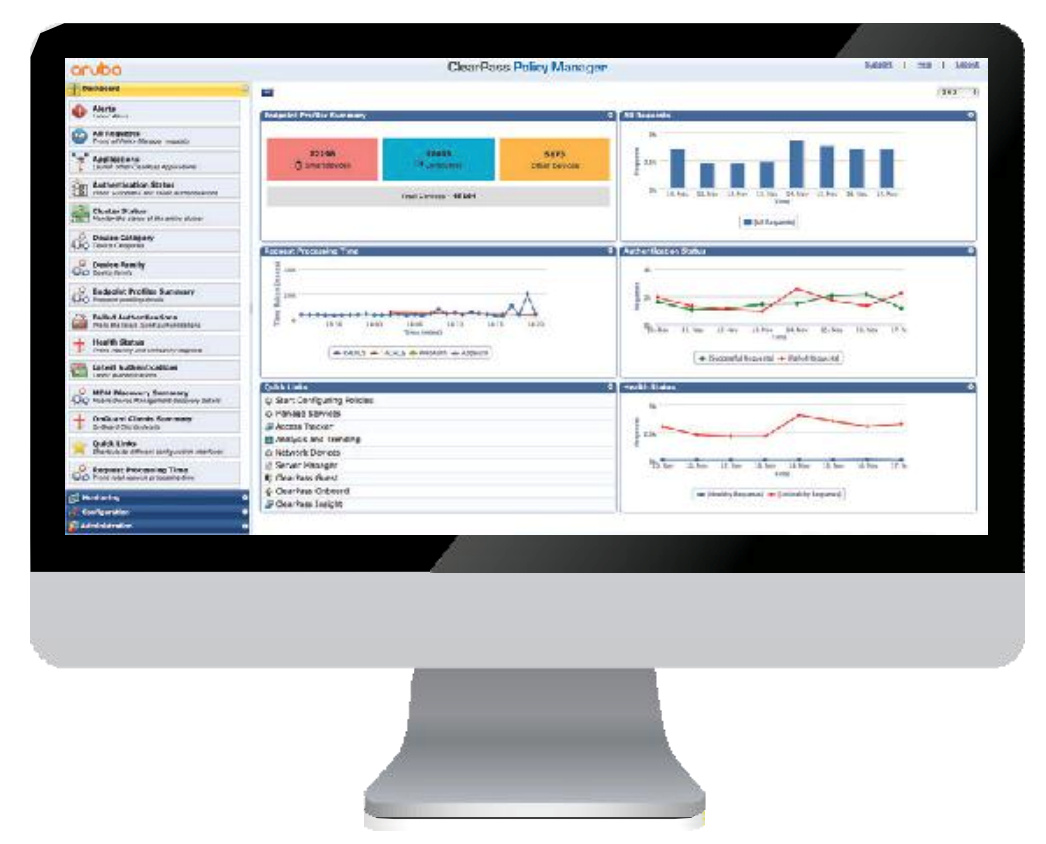 ● ClearPass策略管理器为物联网、自带设备(BYOD)、企业设备以及任何多供应 商有线、无线和VPN基础设施的员工、承包商和访客提供基于角